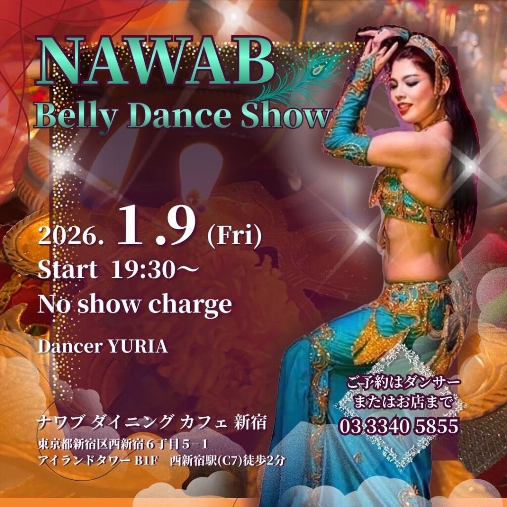 1/9(金) Restaurant Show @NAWAB(西新宿) 2026 1/05 イベント・ショー紹介 2026/01/05 新年最初のショーは、1/9(金)西新宿のナワブから🌸 西新宿駅C7出口から徒歩2分❣️ 19時30分ショースタート、ショーチャージはありません🌹 新年会を兼ねて是非お越しください💕 イベント・ショー紹介 YURIA セクシー田中さん ベリーダンス ゆりあ ユリア 原宿 国分寺 大岡山 春日部 横浜 用賀 1/4(日)〜1/11(日) レッスンのお知らせ 関連記事 12/28(日) Year End Haflat @Cafe Bora Bora(原宿) 2025/12/22 12/21(日) Liz Kimura Birthday &Xmas Live @All of Me Club六本木 2025/12/15 12/13(土)Restaurant Show @RUMY(高円寺) 2025/12/12 11/30(日)The Arabian Night @六本木 R3 Club Lounge 2025/11/29 11/28(金) 14:00〜パーソナリティ@シェアハピラジオ 2025/11/28 11/24(月・祝)・11/25(火) El Helem SHOW@ 2025/11/24 11/9(日) ハムサ・カマラート@新大久保 2025/11/07 11/4(火) Restaurant Show @Cafe Bohemia (渋谷) 2025/11/01