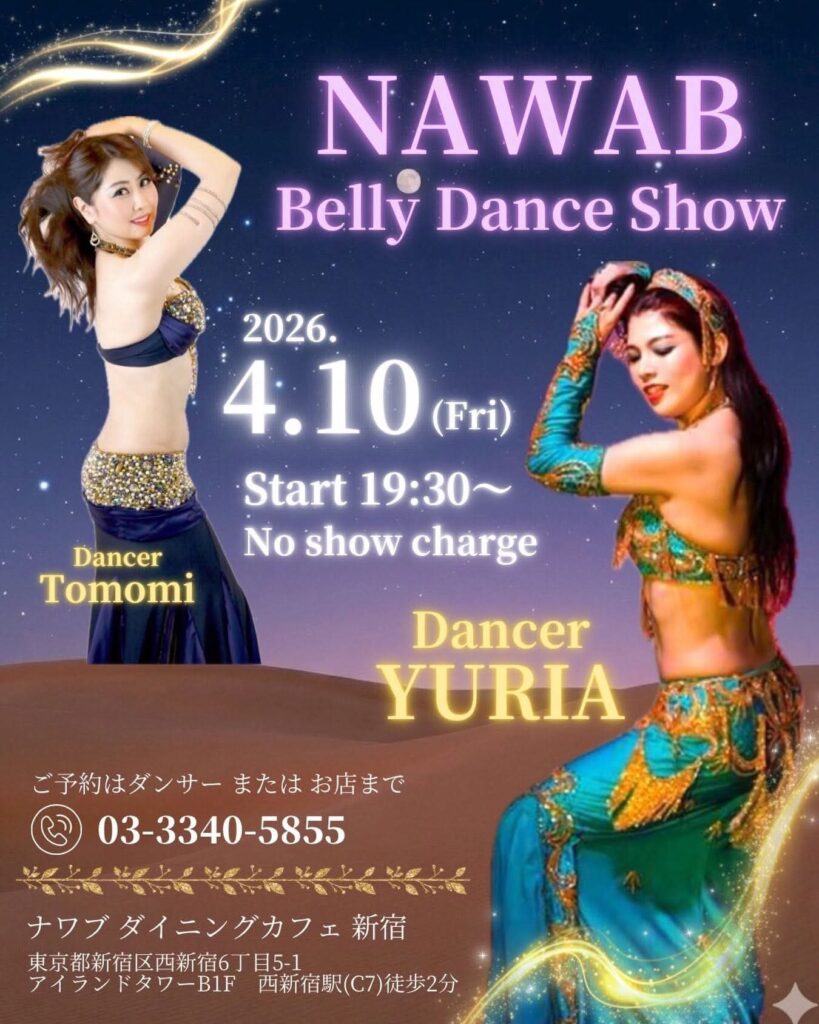 4/10(金) Restaurant Show@NAWAB(西新宿) 2026 4/09 イベント・ショー紹介 2026/04/09 4/10(金)は、西新宿駅すぐの素敵なレストラン、ナワブに出演します🌸 生徒のTomomiも踊ります✨ 19時半ショースタート❣️ 皆様、ぜひお食事とベリーダンスを楽しみにいらしてください🩷 イベント・ショー紹介 YURIA セクシー田中さん ベリーダンス ゆりあ ユリア 原宿 国分寺 春日部 用賀 蒲田 4/6(月)〜4月12日(日) レッスンのお知らせ 関連記事 4/4(土)13:00〜 4月誕生祭@シルクロードカフェ(錦糸町) 2026/03/26 4/2(木) Restaurant Show @Cafe Bohemia (渋谷) 2026/03/15 3/29(日)The Arabian Night @六本木 R3 Club Lounge 2026/03/11 3/14(金) Restaurant Show @RUMI(高円寺) 2026/02/23 2/27(金)Restaurant Show @フィッシュテール(上本郷) 2026/02/05 2/22(日)The Arabian Night @六本木 R3 Club Lounge 2026/02/05 2/21(土) オペラ 独身貴族の遺言@新宿ガルバホール(西新宿) 2026/02/05 2/13(金) Restaurant Show @RUMI(高円寺) 2026/02/01